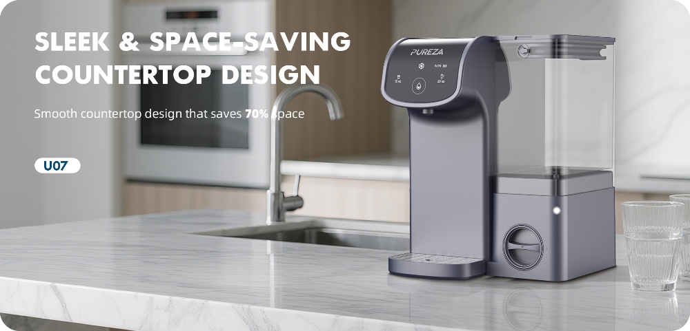 Platzsparender Wasserfilter für die Arbeitsplatte – 70 % kompakter