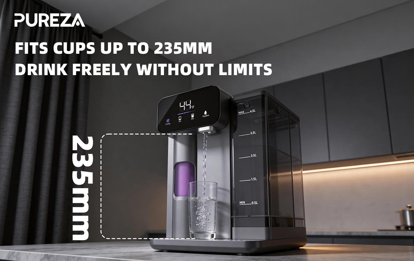 The PU-T02 countertop water purifier features a compact countertop design that fits cups up to 9.25 inches (235mm) tall, taking minimal space while remaining stylish and practical. It is plug-and-play, with a 4.5L water tank and a filter life of 1135L (approximately six months), reducing the hassle of frequent maintenance.