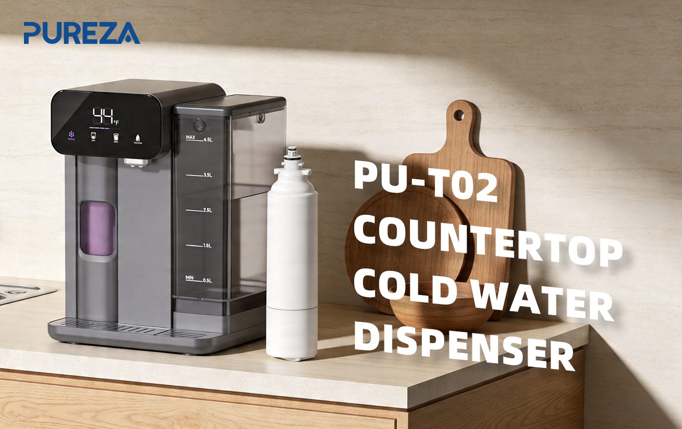 The PU-T02 countertop cold water dispenser is designed around this concept—bringing filtration and cooling together in one seamless system.