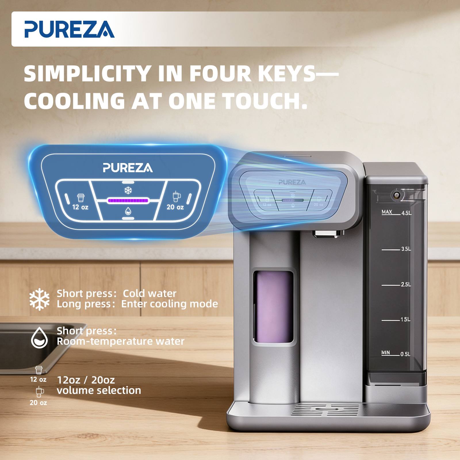 Mit seinem 1,2-Liter-Kaltwassertank speichert der PU-T02 mehr gekühltes Wasser und gewährleistet so eine gleichbleibende Kühlleistung auch bei mehrmaliger Nutzung. Der 4,5-Liter-Zulaufwassertank ist ideal für Familien und kleine Büros, verkürzt Wartezeiten und sorgt dafür, dass jederzeit erfrischendes Kaltwasser bereitsteht.